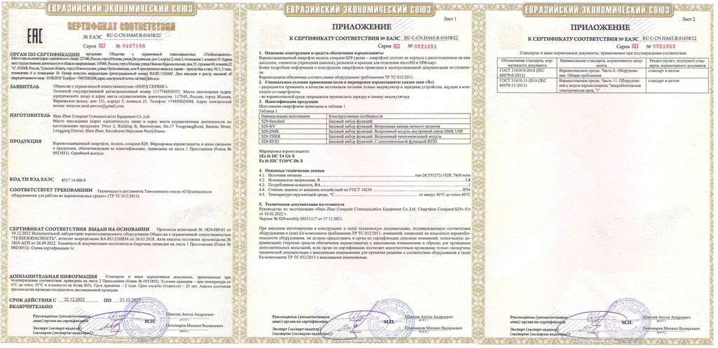 В ЕврАзЭС сертифицированы (см. фото к товару) следующие модификации Conquest S29 Ex: