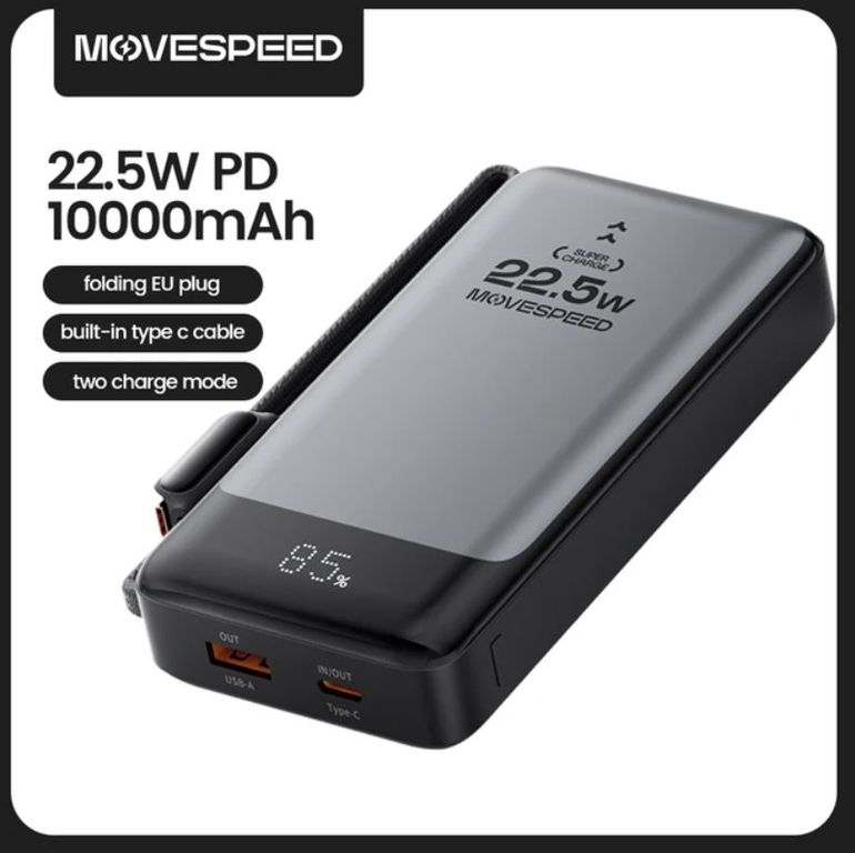 MOVESPEED MSP17 Power Bank 10000 мАч 22,5 Вт - это компакный аккумулятор на 10000 мАч с выдвижной вилкой.